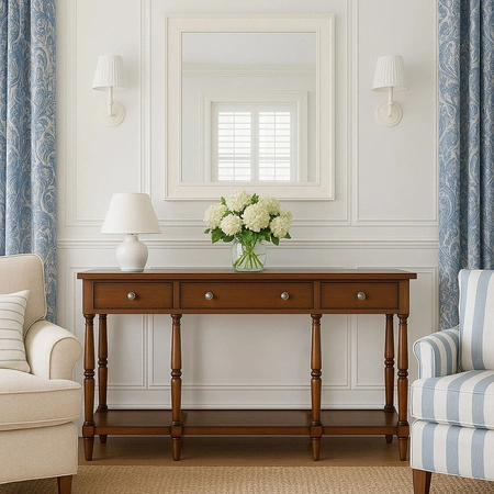 Długa konsola do przedpokoju z szufladami – elegancja i funkcjonalność w stylu kolonialnym