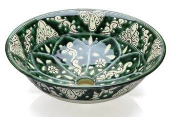 Meksykańska umywalka ceramiczna, ręcznie malowanaPrzepiękna,ręcznie wykonanaceramiczna umywalkaz Meksyku w kolorze cimnej zieleni,która dominuje jako tło na którym znajdują się białe motywy rożlinne.. Ekskluzywna ceramiczna umywana nablatowa wykonana trad
