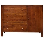 Elegancka komoda drewniana do salonu w stylu indyjskim, wykonana z litej akacji, łączy solidność wykonania z praktycznością. Dzięki czterem szufladom i zamykanym szafkom z półką zapewnia wyjątkową funkcjonalność i piękno naturalnego drewna.