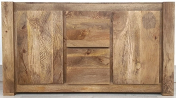 Stylowa komoda z litego drewna mango w ciepłym kolorze toffi. Wyposażona w dwie pojemne szuflady i dwie szafki z półkami, to idealny wybór do wnętrz nowoczesnych i klasycznych.