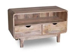 Drewniana szafka RTV z mango- vintageWdzięcznie wyglądająca szafka RTV loft wykonana z drewna mango w typowo skandynawskiej stylistyce. Praktyczne szuflady, wnęka na sprzęt, zgrabne nóżki oraz atrakcyjna stylistyka z zaokrąglonymi krawędziami to atuty meb
