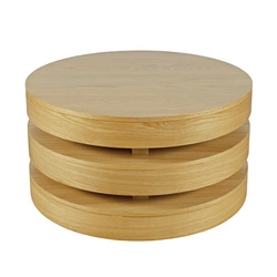 Nowoczesny stolik kawowy z litego drewna dębowego. Okrągły blat o średnicy 91,5 cm osadzony na trójelementowej podstawie z pionowymi dystansami. Idealny do salonu jako dekoracyjny i funkcjonalny element wnętrza.