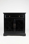 Komoda z ażurowymi drzwiami ANTIQUE BLACKStylowa, prowansalska komoda dwudrzwiowa z jedną dużą szufladą. Komoda została wykonana w kolorze antycznej czerni. Szuflada i drzwi posiadają eleganckie srebrne uchwyty a drzwiczki są przeszklone o azurowym wykon