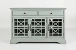 Komoda z ażurowymi drzwiami Earl Grey.Prowansalska, drewniana komoda trzydrzwiowa z dwiema szufladami. Drewniana kmoda została wykonana w kolorze szaromietowym. Szuflady i drzwi posiadają eleganckie uchwyty a drzwiczki są przeszklone o azurowym wykonani