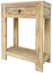 Wąska konsola drewniana z szufladą i półką, wykonana z litego drewna mango w naturalnym kolorze. Kompaktowe wymiary sprawiają, że świetnie sprawdzi się w przedpokoju, salonie czy sypialni. Solidna konstrukcja, matowe wykończenie, klasyczny design.