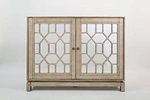Mała drewniana komoda lustrzana w stylu Glamour w kolorze starego pozłacanego srebra. Komoda wykonana została z drewna i posiada ażurowe, lustrzane drzwi. Elegancka komoda dwudrzwiowa do salonu.PRZED ZAKUPEM PROSIMY- POTWIERDŹ DOSTĘPNOŚĆ: