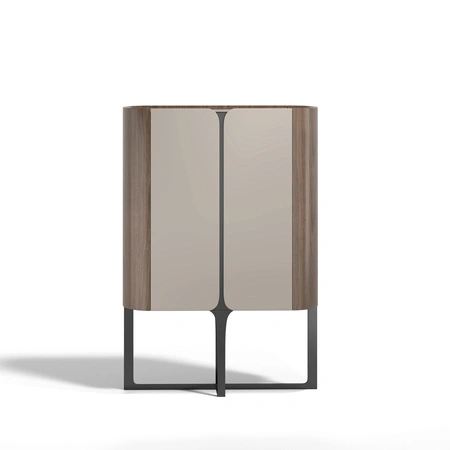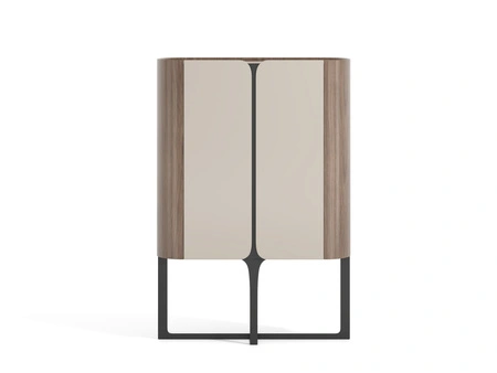 - Funkcjonalna komoda z orzecha włoskiego i kaszmiru wyposażona w dwie zamykane szafki i półki. System soft close, czarna metalowa podstawa i zaokrąglona bryła zapewniają wygodę użytkowania i nowoczesny wygląd.