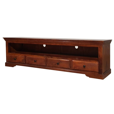 Komoda RTV kolonialna 200 cm z litego drewna akacji w kolorze ciepłego brązu. 4 szuflady, szeroka półka na sprzęt RTV, ozdobny frezowany gzyms i stylizowana podstawa. Ponadczasowy design i trwałość w jednym!