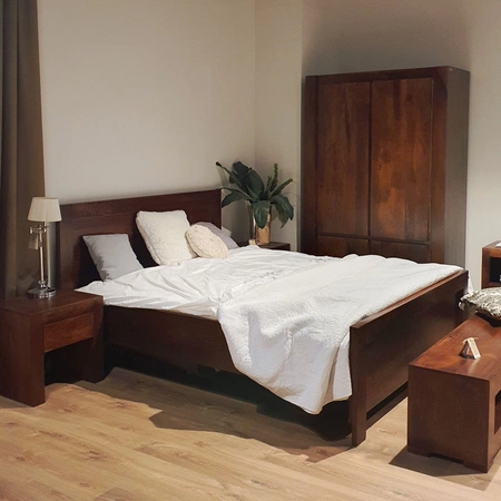 - Kompaktowe łóżko drewniane 140x200 z litego mango w kolorze ciepłego brązu. Prosty zagłówek, naturalne wykończenie i solidny stelaż – idealne do sypialni w stylu kolonialnym i nowoczesnym.