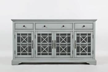 Komoda 153 cm Earl Grey.Prowansalska, drewniana komoda czterodrzwiowa z trzema szufladami. Drewniana kmoda została wykonana w kolorze szaromietowym. Szuflady i drzwi posiadają eleganckie uchwyty a drzwiczki są przeszklone o azurowym wykonaniu.PRZED ZAKU