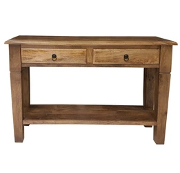 Konsola z drewna mango w kolorze toffi o szerokości 110 cm, z szufladami i półką. Dodatek o wyjątkowej barwie i elegancji, do nowoczesnych wnętrz.