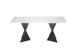 Nowoczesny stół Modig M13 z białym blatem marmurowym i złotymi, ażurowymi nogami ze stali nierdzewnej.