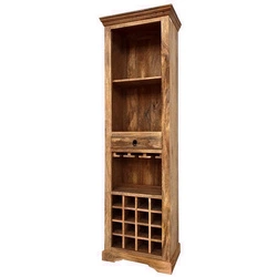 Regał kolonialny na wino 60 cm z litego drewna mango. Kratownica na butelki, uchwyty na kieliszki, pojemna szuflada i półki na alkohole. Klasyczny styl, eleganckie wykończenie, kolor toffi.