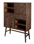 Stylowa komoda z litego drewna akacjowego, inspirowana stylem vintage i boho. Wykończona w ciemnobrązowym kolorze, z metalowymi uchwytami i intarsją na drzwiach. Posiada 2 szuflady i 4 półki.