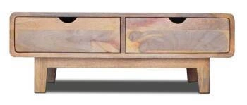 Drewniany stolik kawowy loft z szufladamiZgrabny stolik kawowy w stylu vintage - loft, z szufladkami i łagodnymi , zaokrąglonymi krawędziami. Zimna kolorystyka skandynawskich klimatów oraz użyte drewno z mango nadają stolikowi charakteru. Doskonały dodate