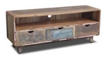 Szafka RTV z drewna w stylu loftWdzięcznie wyglądająca szafka RTV loft wykonana z drewna z odzysku, w typowo skandynawskiej stylistyce. Praktyczne szuflady, wnęka na sprzęt, zgrabne nóżki oraz atrakcyjna stylistyka z zaokrąglonymi krawędziami to atuty meb