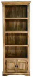 Wąski regał kolonialny 80 cm z litego drewna mango w kolorze toffi. Półki na książki, zamykana szafka, dekoracyjne frezy. Idealny do salonu, gabinetu i jadalni. Trwałość, elegancja i ponadczasowy design.