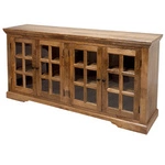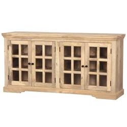 Elegancka komoda przeszklona z litego drewna mango w kolorze naturalnym, idealna do salonu lub jadalni. Zmieści talerze, naczynia i ozdoby, wprowadzając do wnętrza niepowtarzalny styl kolonialny.