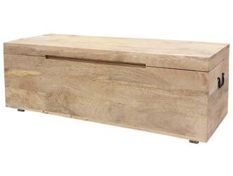 Elegancki kufer drewniany z mango, idealny do przechowywania i jako element dekoracyjny. Wyposażony w kółka ułatwiające przemieszczanie oraz uchwyty dla wygody. Doskonały do salonu, przedpokoju lub sypialni.
