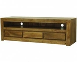 Indyjska szafka RTV z mango 170 cmKomoda RTV wykonana ręcznie z litego drewna mangowca. Szafka posiada 3 szuflady oraz wnękę na całej długości szafki. Staranne wykończenie dodaje meblom uroku i elegancji. Szafka wykonana w kolorze naturalnego jasneg brązu