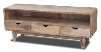 Szafka RTV loft z litego drewna mangoWdzięcznie wyglądająca szafka RTV loft wykonana z drewna mango, w typowo skandynawskiej stylistyce. Praktyczne szufladki, wnęka na sprzęt, zgrabne nóżki oraz atrakcyjna stylistyka z zaokrąglonymi krawędziami to atuty m