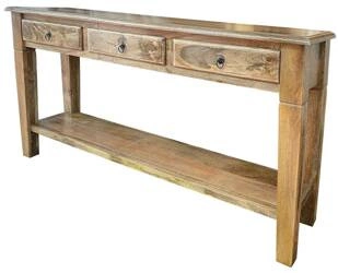 Elegancka drewniana konsola z trzema szufladami i półką. W całości wykonana z litego drewna mango, wykończona w ciepłym brązie. Doskonała do holu, salonu i gabinetu. Solidna konstrukcja i klasyczny styl w jednym!