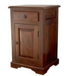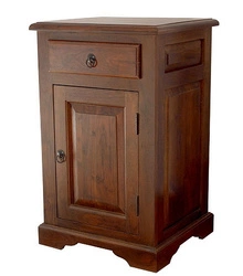 Elegancka i funkcjonalna komoda z litego drewna akacji. Szuflada i półki za drzwiczkami, wykończenie w ciepłym brązie z satynowym połyskiem. Idealna do salonu, sypialni i gabinetu.