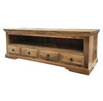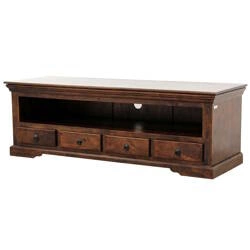 Szafka RTV kolonialna 150 cm z litego drewna akacji indyjskiej. Posiada 4 szuflady, szeroką półkę na sprzęt RTV i otwór na kable. Eleganckie frezy i klasyczny design sprawiają, że doskonale pasuje do wnętrz w stylu kolonialnym.