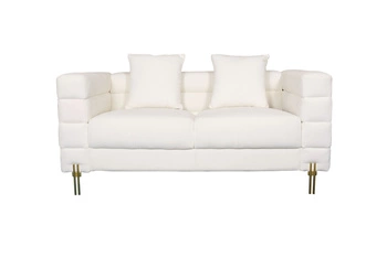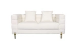 Elegancka dwuosobowa sofa, pokryta modną tkaniną boucle w kolorze złamanej bieli.Trwałość dzięki solidnym nogom ze stali nierdzewnej w kolorze złotym. Unikalny wygląd dzięki srebrnemu połyskowi nici w tkaninie boucle oraz subtelności poziomych przeszyci.