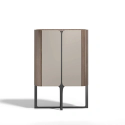 Funkcjonalna komoda z orzecha włoskiego i kaszmiru wyposażona w dwie zamykane szafki i półki. System soft close, czarna metalowa podstawa i zaokrąglona bryła zapewniają wygodę użytkowania i nowoczesny wygląd.
