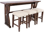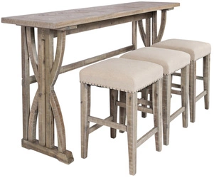Loftowy stół barowy z 3 hokerami – naturalne drewno, beżowa tapicerka, styl vintage