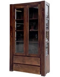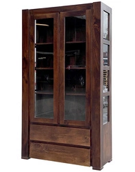 Ekskluzywna witryna z litego drewna akacji w odcieniu orzecha włoskiego. Ręcznie wykonana w Indiach, wyposażona w szklane drzwiczki, półki i dwie praktyczne szuflady. Idealna do salonu lub jadalni w stylu kolonialnym.