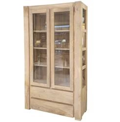 Przeszklona witryna z litego drewna mango w naturalnym kolorze – 4 półki, 2 szuflady, przeszklone drzwi i boki. Idealna do salonu, jadalni lub gabinetu.