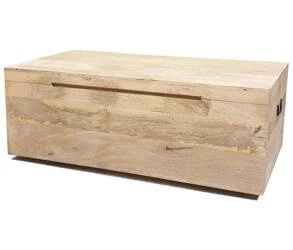 Stylowy kufer z jasnego drewna mango o prostej formie i dużej pojemności. Wyposażony w czarne metalowe uchwyty i podwyższoną drewnianą stopę. Idealny jako stolik kawowy, siedzisko lub pojemnik do przechowywania w każdym wnętrzu.