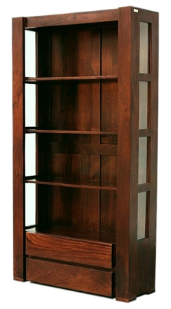 - Elegancki regał z półkami i dwiema praktycznymi szufladami, wykonany w całości z litego drewna mango w ciepłym brązie. Idealny jako biblioteczka lub miejsce na dekoracje – nowoczesny design z oszklonymi bokami.