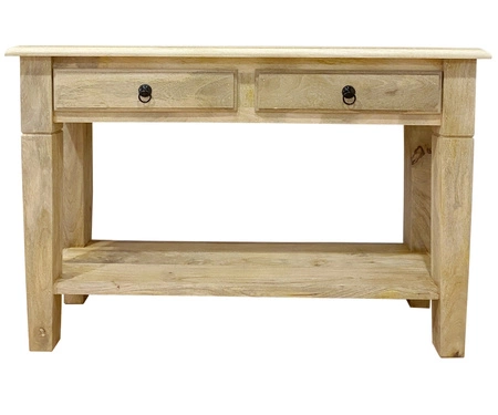 Szukasz mebla, który łączy w sobie ponadczasową elegancję i praktyczność? Drewniana konsola z szufladami i półką to wyjątkowy model wykonany w 100% z litego drewna mango, zabezpieczony ekologicznym wodnym lakierem matowym, który podkreśla jego naturalny kolor i strukturę słojów.