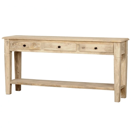 Kolonialna konsola drewniana z trzema szufladami i półką – 170 cm. Wykonana w 100% z litego drewna mango, w naturalnym wykończeniu. Styl kolonialny, elegancki design i funkcjonalność. Doskonała do przedpokoju, salonu, gabinetu lub sypialni.