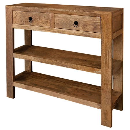 - Konsola drewniana ZEN 100 cm w kolorze toffi to połączenie funkcjonalności i elegancji. Dwie szuflady i otwarte półki oferują praktyczną przestrzeń do przechowywania, a naturalny odcień drewna mango wnosi ciepło do każdego wnętrza.