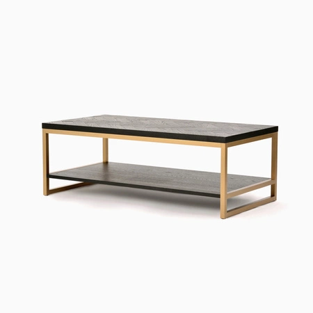 - Prostota i elegancja w jednym. Prostokątny stolik kawowy z drewna dębowego i bukowego, z czarnym blatem z intarsją i złotymi nogami. Idealny wybór do salonu w stylu retro i glamour.