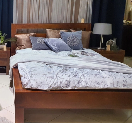 Minimalistyczna forma oraz drewniany zagłówek w kolorze ciepłego brązu doskonale komponują się z wnętrzami w stylu loftowym, skandynawskim i industrialnym. Szerokie boki łóżka podkreślają jego masywny wygląd i elegancję, a prosty design eksponuje naturalne piękno drewna mango.