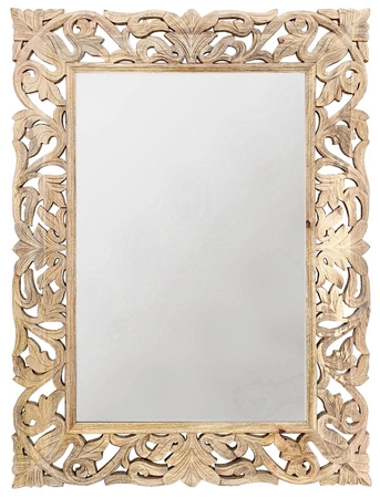 Lustro w drewnianej ramie rzeźbionej ręcznie to prawdziwe dzieło sztuki. Wykonane z najwyższej jakości litego drewna mango, przyciąga wzrok misternymi roślinnymi zdobieniami i ażurową strukturą. To doskonały wybór dla osób ceniących klasyczny styl z egzotycznym akcentem.