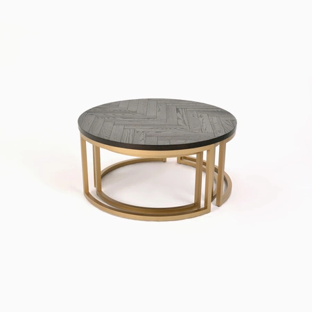 Zestaw stolików kawowych łączy w sobie funkcjonalność i wyjątkowy wygląd. Okrągłe blaty z intarsją w jodełkę, wykonane z drewna bukowego w kolorze czarnym z połyskiem, dodają wnętrzu szyku. Złote nogi w półmacie z litego drewna dębowego podkreślają elegancję stolików, idealnie wpisując się w styl glamour i retro.