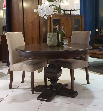 Ten okrągły stół kolonialny doskonale odnajdzie się w przestrzeniach o klasycznym i eleganckim charakterze. Ciepły brązowy kolor drewna mango wniesie do wnętrza przytulność i harmonię, a jego solidna konstrukcja zapewni komfort użytkowania przez długie lata.