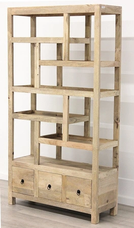 - Wyjątkowy regał wykonany z litego drewna mango z asymetrycznymi półkami i trzema pojemnymi szufladami. Idealny do nowoczesnych wnętrz, dodając im indywidualnego charakteru i ciepła naturalnego drewna.
