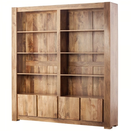 - Duży regał drewniany 180 cm z litego mango w kolorze toffi. 4 półki, 2 szafki, minimalistyczny design, trwała konstrukcja. Idealny do salonu, gabinetu i biura. Styl kolonialny, nowoczesny.