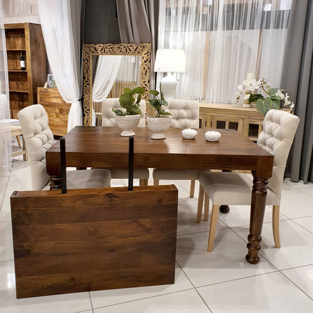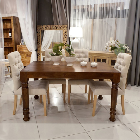 Stół został zaprojektowany z myślą o komforcie i trwałości – jego masywny blat i dodatkowe dostawki, umieszczone na metalowych prowadnicach, pozwalają w prosty sposób dostosować jego długość do potrzeb chwili. Dzięki temu pomieści zarówno mniejsze grono, jak i większą liczbę osób podczas rodzinnych spotkań czy przyjęć. Grubość drewna, wynosząca około 2,5 cm, zapewnia stabilność i odporność na codzienne użytkowanie, co czyni go idealnym wyborem dla każdego domu, gdzie stoły indyjskie stanowią centralny punkt życia domowego.