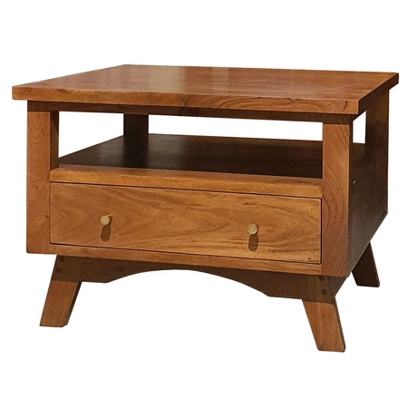 - Elegancki stolik kawowy wykonany z litego drewna akacji w kolorze jasnego orzecha. Wyposażony w dwie szuflady i otwartą półkę, łączy funkcjonalność z ponadczasowym stylem, idealnie wpisując się w przestrzeń każdego salonu.