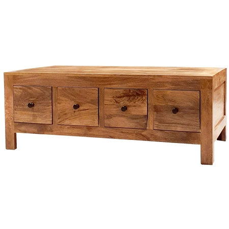 - Elegancki stolik kawowy z litego drewna mango w ciepłym odcieniu toffi. Wyposażony w 8 praktycznych szufladek, łączy funkcjonalność z ponadczasowym stylem.