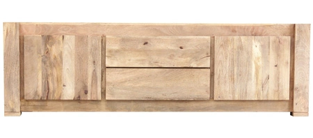 Szafka została w całości wykonana z litego drewna mango, a jej wnętrze skrywa dwie przestronne szuflady oraz dwie zamknięte szafki z półkami, co pozwala na funkcjonalne przechowywanie sprzętu RTV, kabli i akcesoriów.