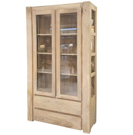 - Przeszklona witryna z litego drewna mango w naturalnym kolorze – 4 półki, 2 szuflady, przeszklone drzwi i boki. Idealna do salonu, jadalni lub gabinetu.